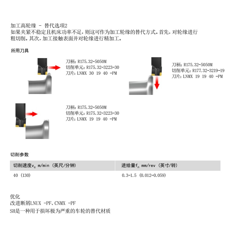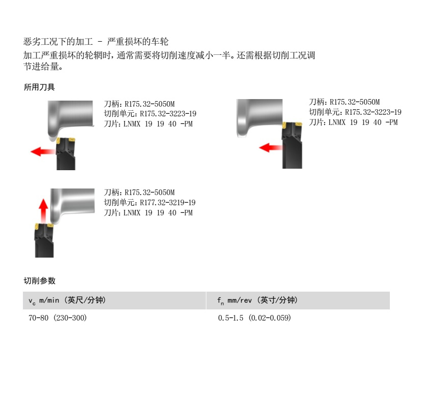 加工嚴(yán)重?fù)p壞的輪輞時(shí),通常需要將切削速度減小一半。還需根據(jù)切削工況調(diào)節(jié)進(jìn)給量。